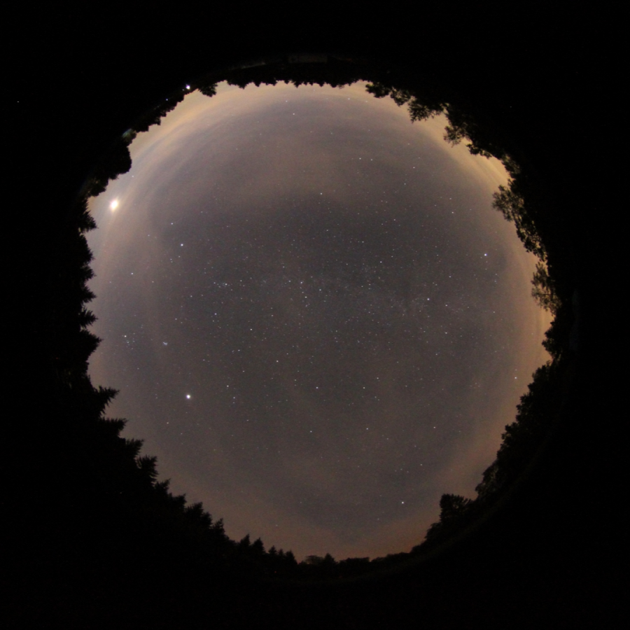 Der Rand des Bildkreises bildet den durch Bäume gebildeten, natürlichen Horizont des Sternwarten-Geländes ab.