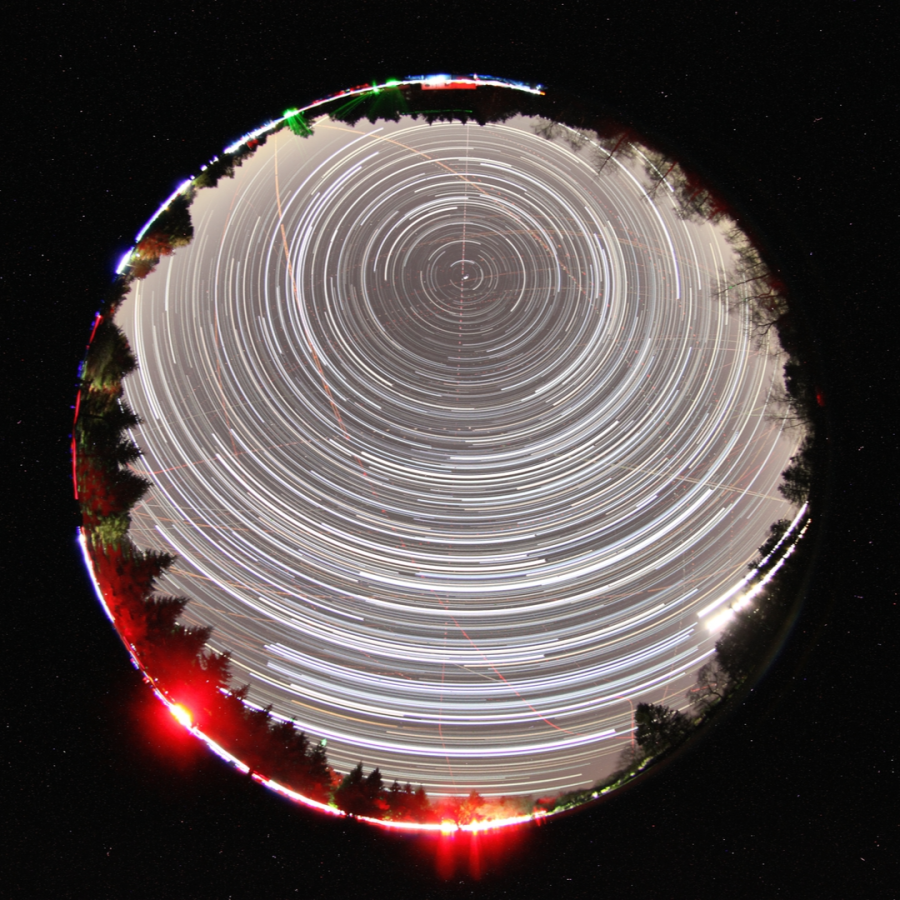 Im obigen Bild sind ca. 100ß Einzelbilder zu einem Gesamtbild zusammengeführt. Die Sterne bewegen sich scheinbar in Bezug auf den lokalen Horizont. Diese scheinbare Bewegung wird durch die Rotation der Erde verursacht. Das Bild zeigt die Spuren der Sterne während des Aufnahmezeitraums von 5 1/2 Stunden.